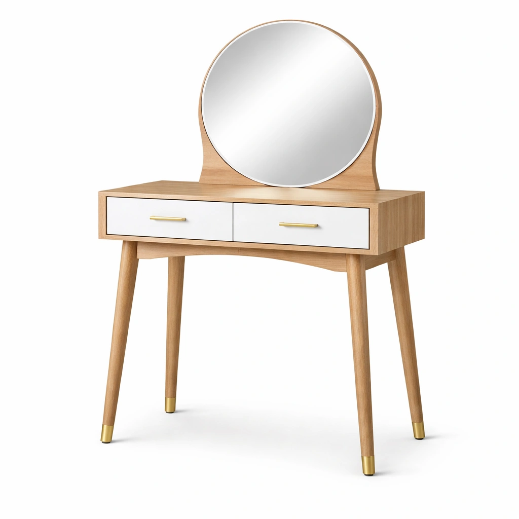 El tocador está fabricado en madera de haya maciza con detalles en metal dorado. Incluye un espejo redondo de 4 mm de grosor y dos cajones frontales. Patas con punta de metal dorado.